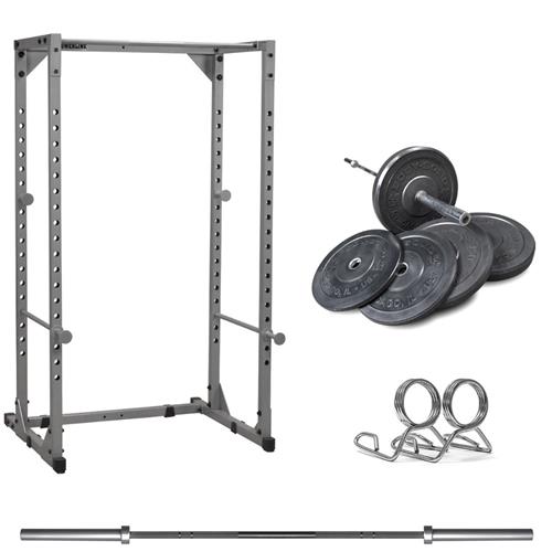 Ce pack vous offre une cage, une barre olympique avec des roulements linéaires, et 100 kg de poids en caoutchouc.